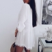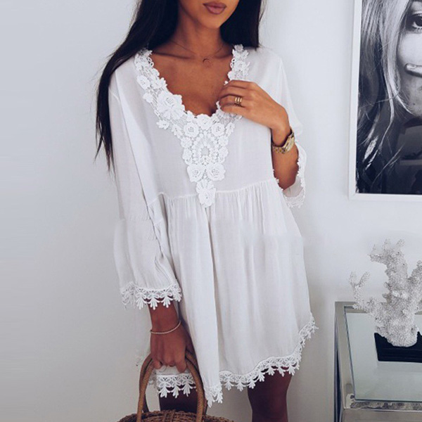 Comes with a classic white tone,accompanied with 3/4 sleeve,v-neck,lace spliced details and a loose silhouette,
