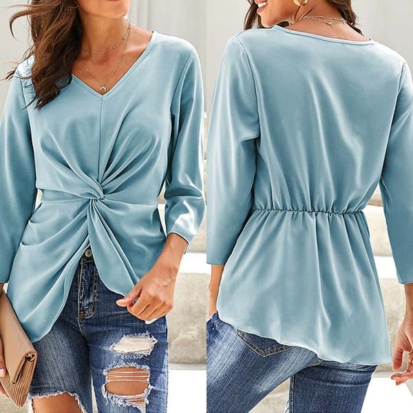 good example. Solid color style,finished with 3/4 sleeve and v-neck design,this piece
