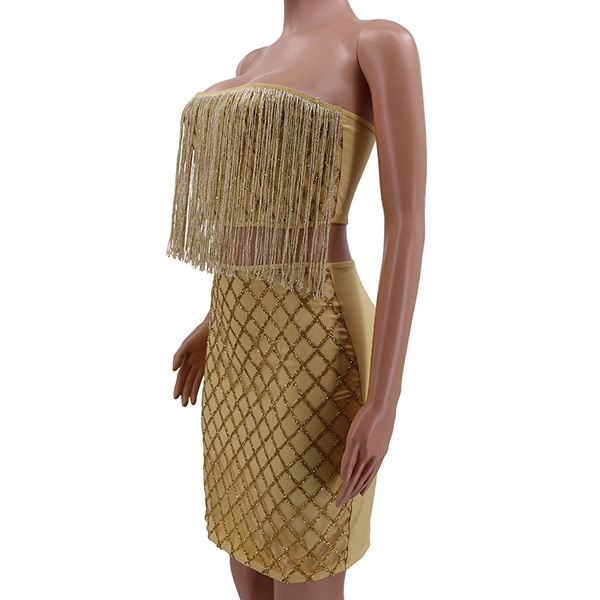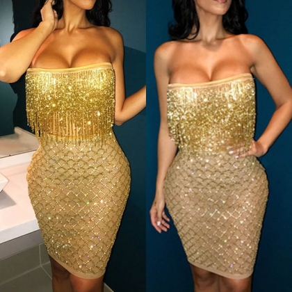 off-shoulder and tassels design, which can highlight your female alluring figure.The exquisite gold