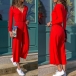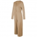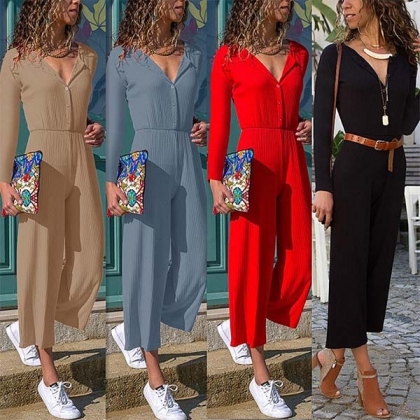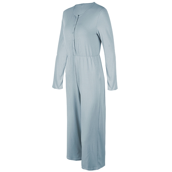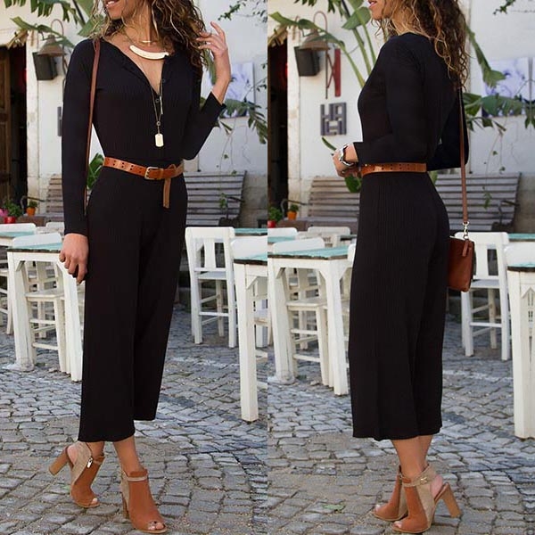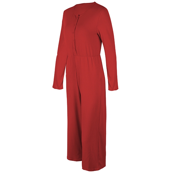 feature a form-and-fitting silhouette, front partial button accent, long sleeves, ankle-length wide leg,
