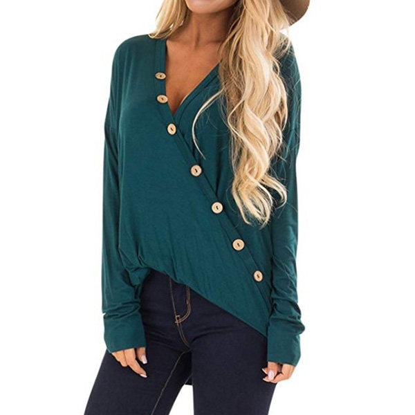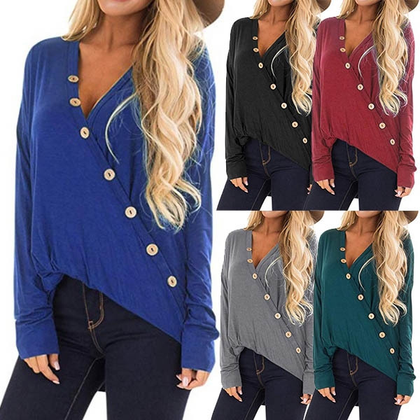 The special top is a good choice to help you show off your female charm. Solid color style,oblique buttons.