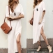 woven,with deep v-neck and short sleeve.Side-slit design can set off your fair skin and slender legs.