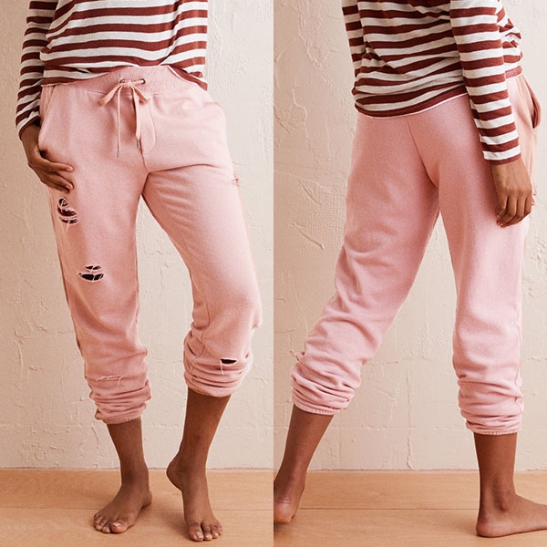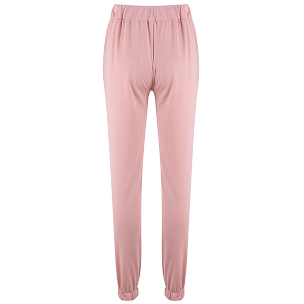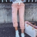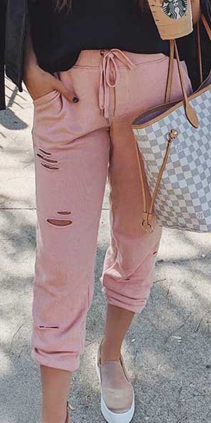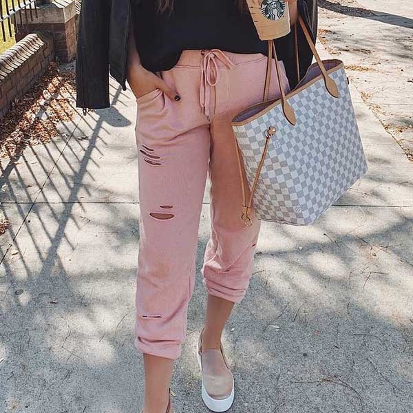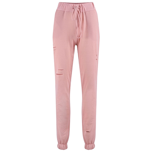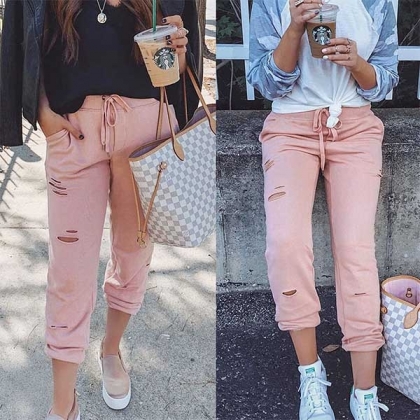 Fashion Solid Color Drawstring Waist Ripped Casual Pants