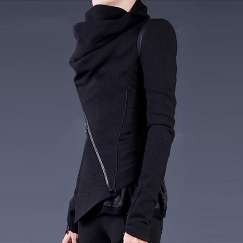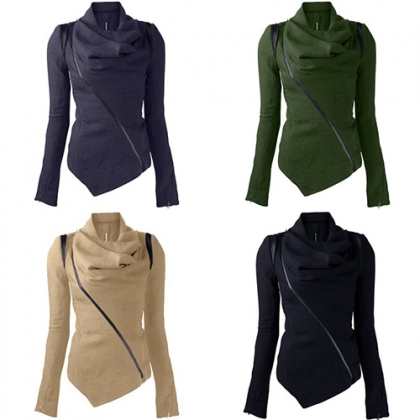 Solid color style,its refined designs such as cowl neck,irregular hem and oblique zipper make