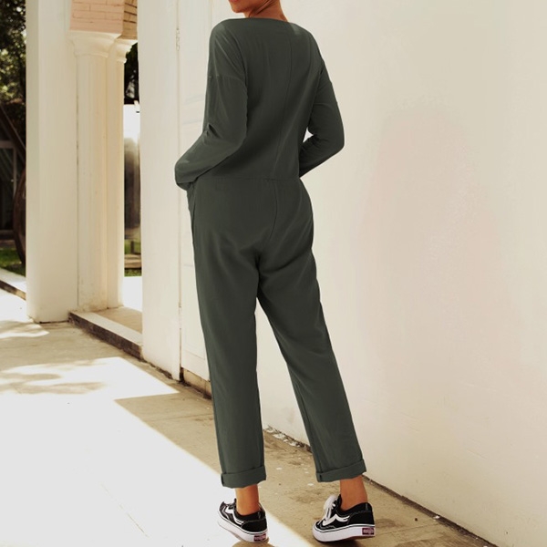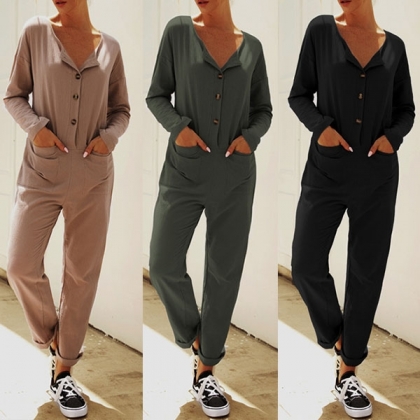 This jumpsuit is a good chance to update your daily style. Crafted in a solid color,the front-button