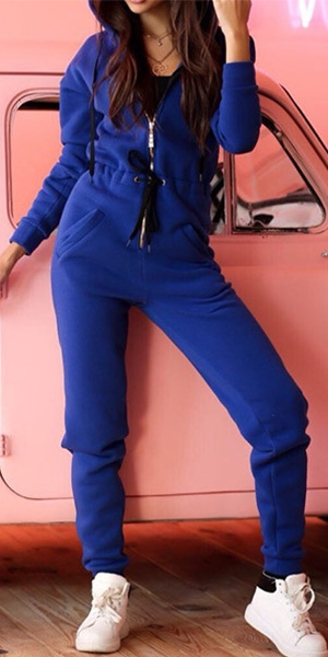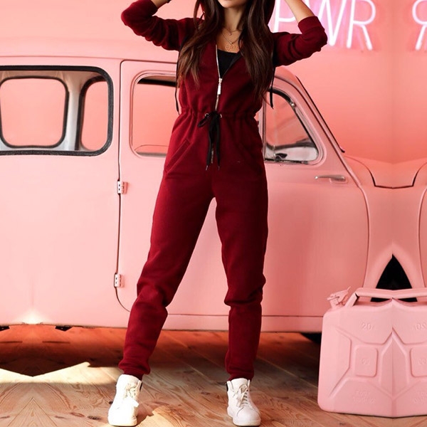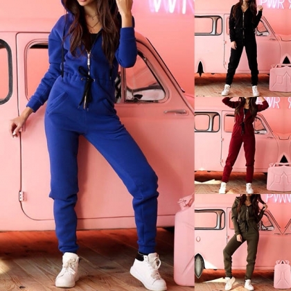 Fashion Solid Color Long Sleeve High Waist Hooded Sports Jumpsuit