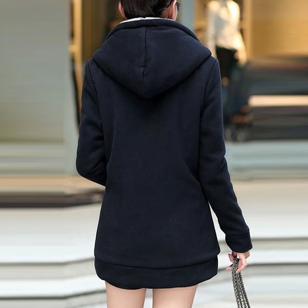 Design i enfärgad färgden ser enkel, generös men ändå stilig ut, medan den huvklädda siluetten och plysch