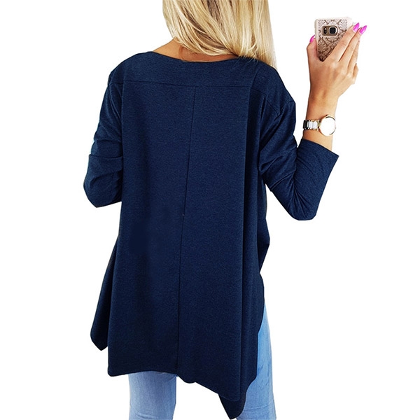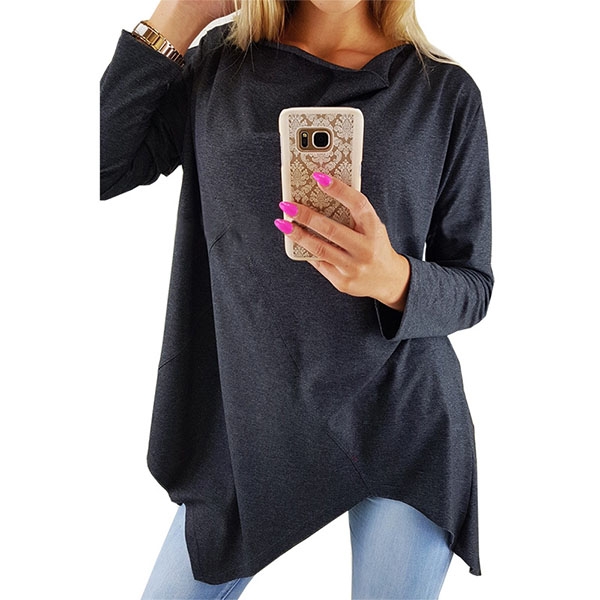 with a solid color tone,accompanied with long sleeve,irregular hem and a loose silhouette,this top knows