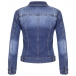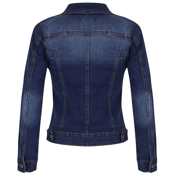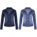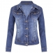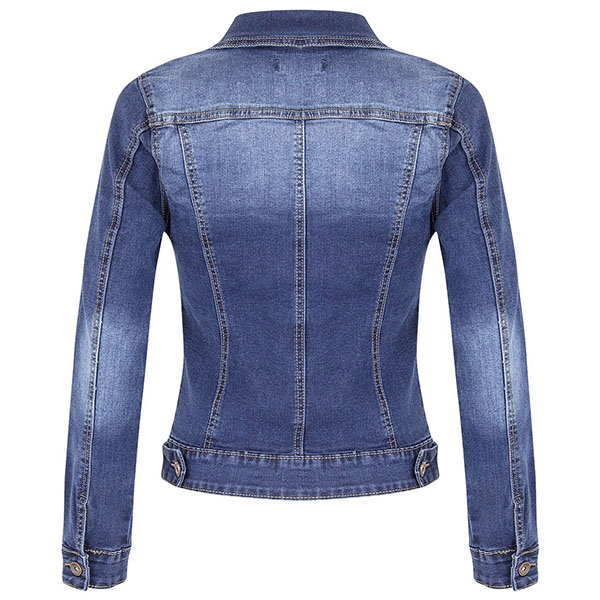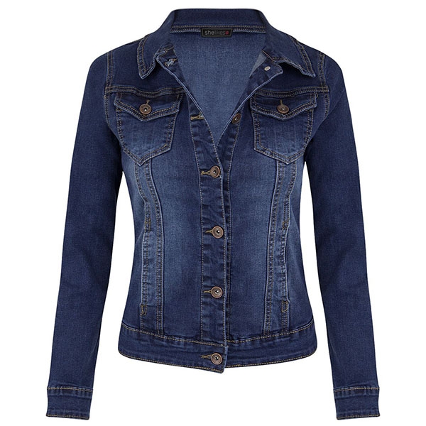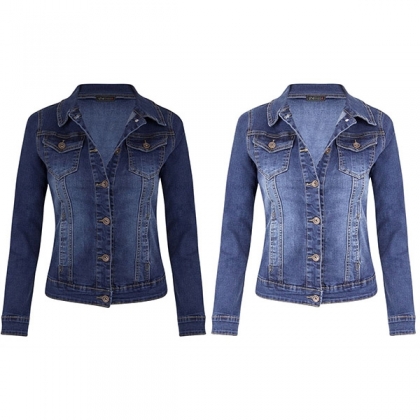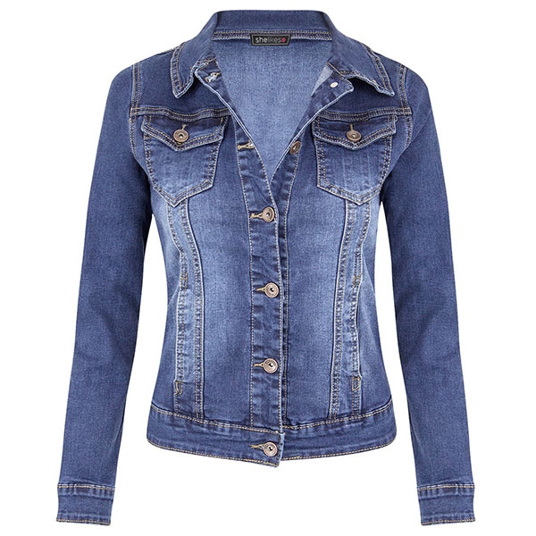 with small lapel collar,buttons down the front and long sleeves and two chest pockets on the denim jacket.A