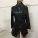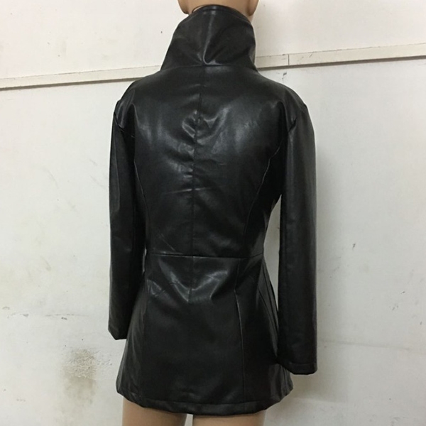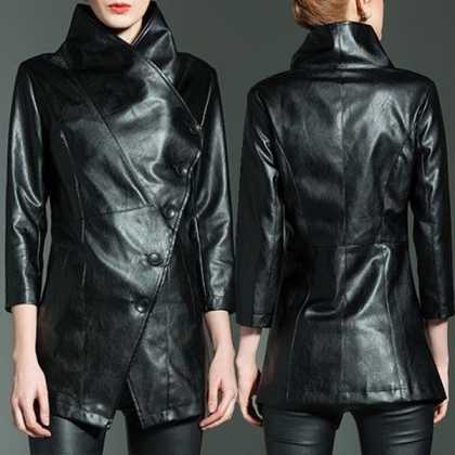 PU leather windbreaker coat. Comes with a classic black tone,the unique lapel and oblique buttons