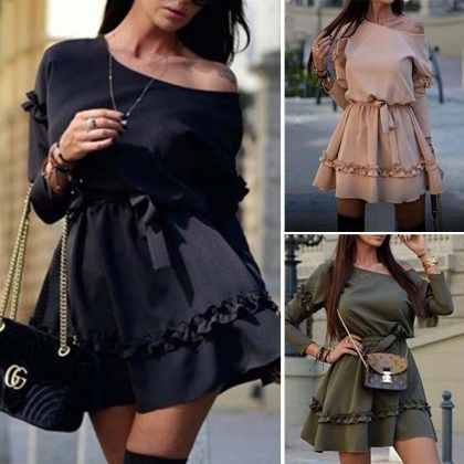 Coming with a solid color,the oblique shoulder and ruffle design make this piece look more attractive.