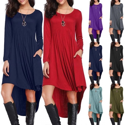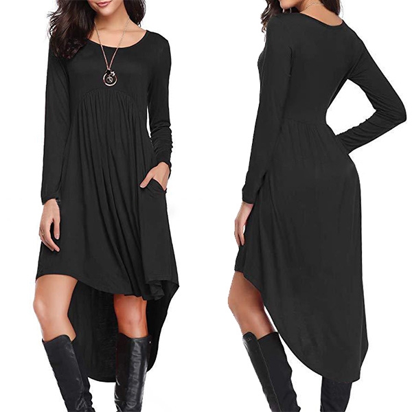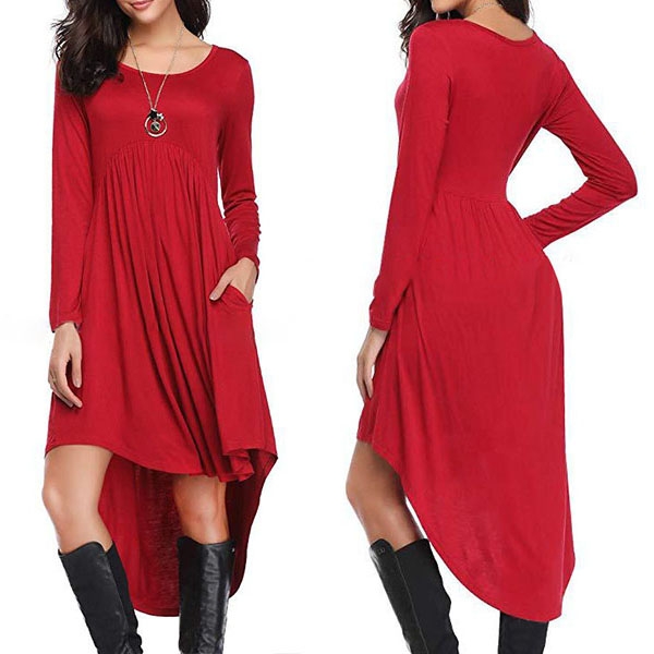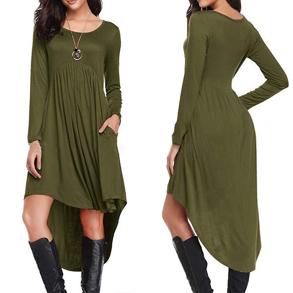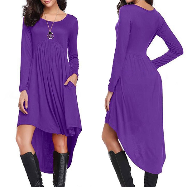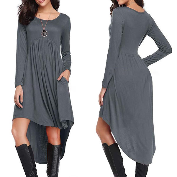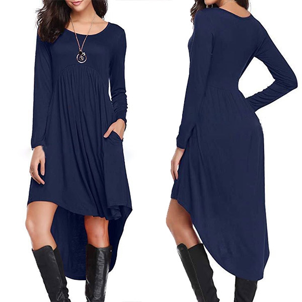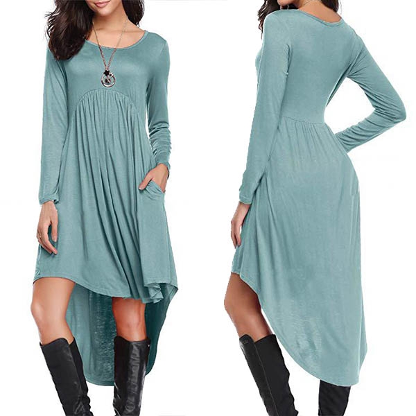 Med lång ärm, rund halsringning och hög-låg fålldesign, kan den här klänningen hålla dig mysig samtidigt som den bibehåller komforten