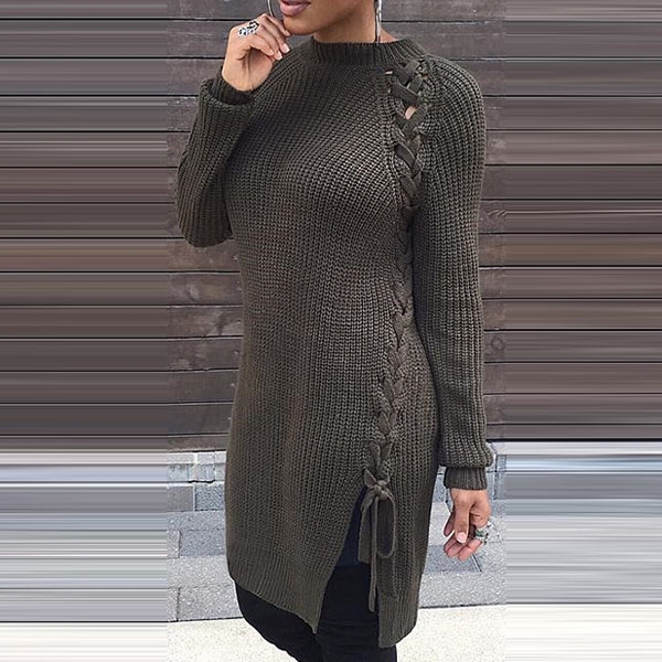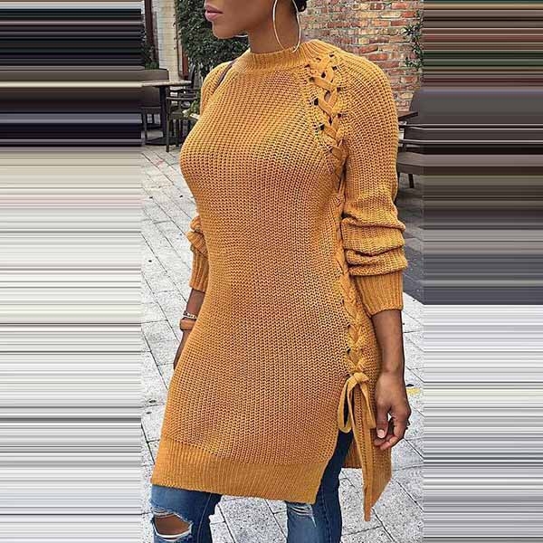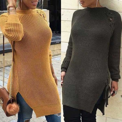 sleeve and round neck design,the slit hem and lace-up design make this piece look so distinctive.