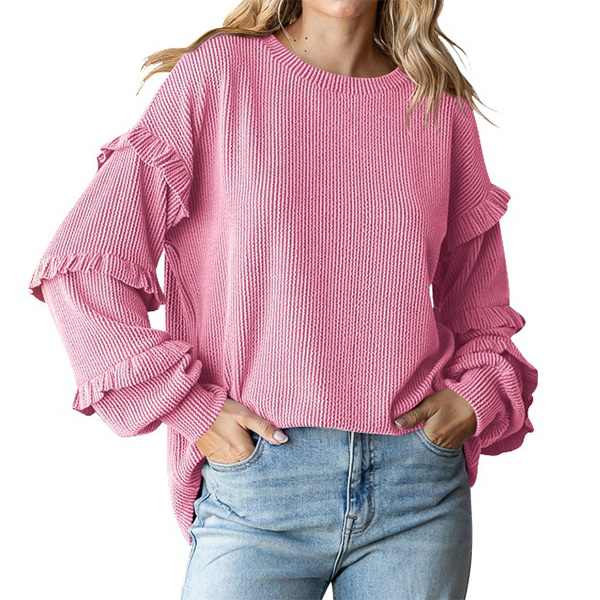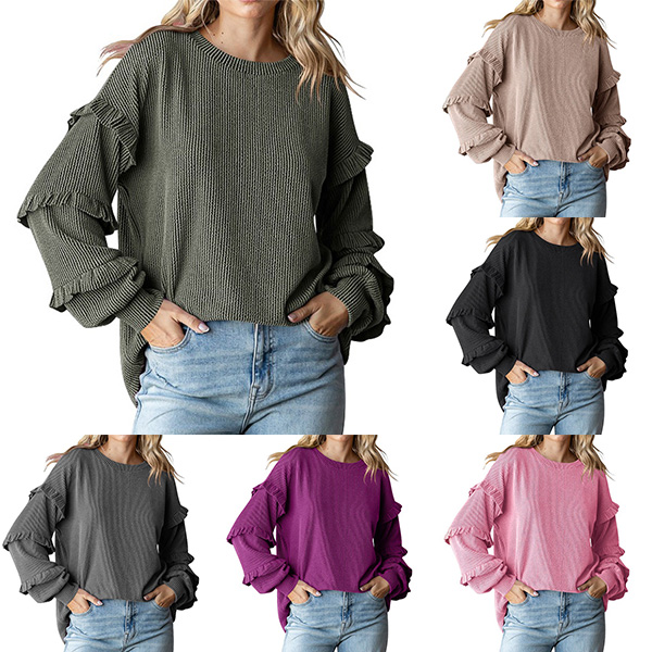 Du kan ta dig in i den här långärmade t-shirten för att hålla dig varm och mysig denna tidiga höst.Kommer med enfärgad,med lång ärm och design med rund hals, enkel men ändå snygg.Den mest attraktiva designen är volangdesignen.Du kan bära den ensam eller som ett undertröja under den kyliga vintern.