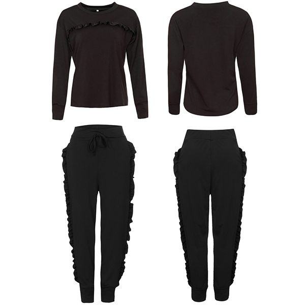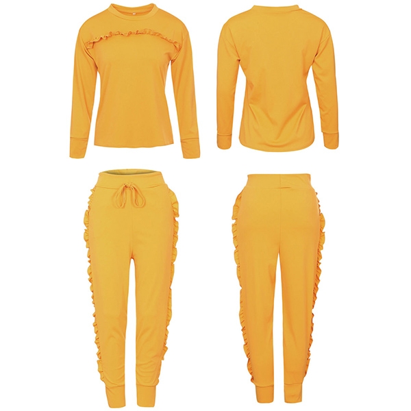 color,including a long sleeve round neck sweatshirt and a sports pants,the eye-catching ruffle details can