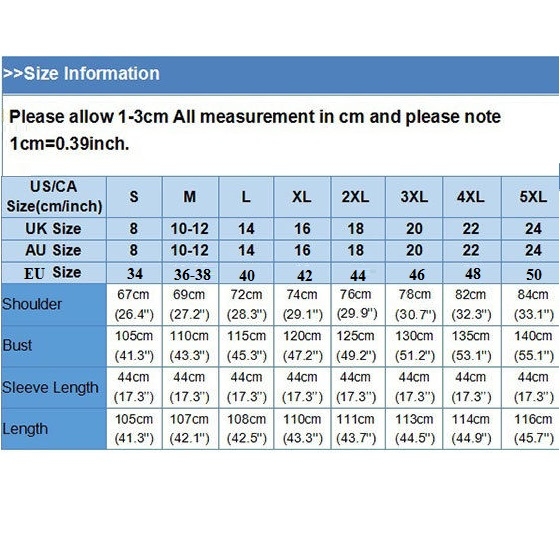 XXXXL : Bust : 135cm(53.15"); Shoulder : 82cm(32.28"); Sleeve : 44cm(17.32"); Length : 114cm(44.88");
