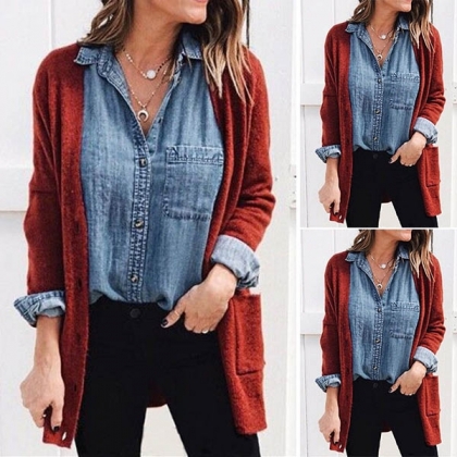 This knit cardigan can give you an easy transition from the summer to the winter. It features a solid color,