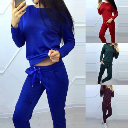 Fashion Solid Color Long Sleeve Sweatshirt + Pants Sports Suit