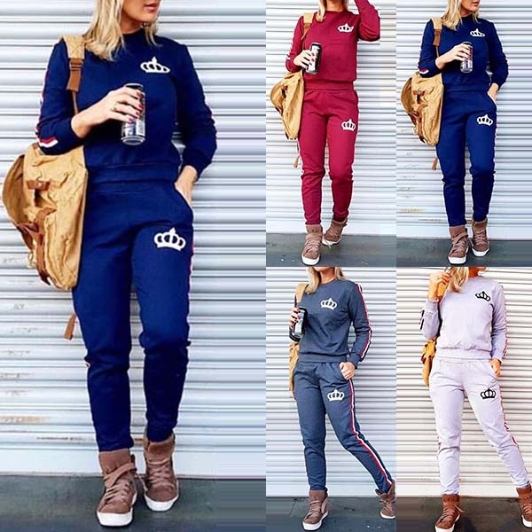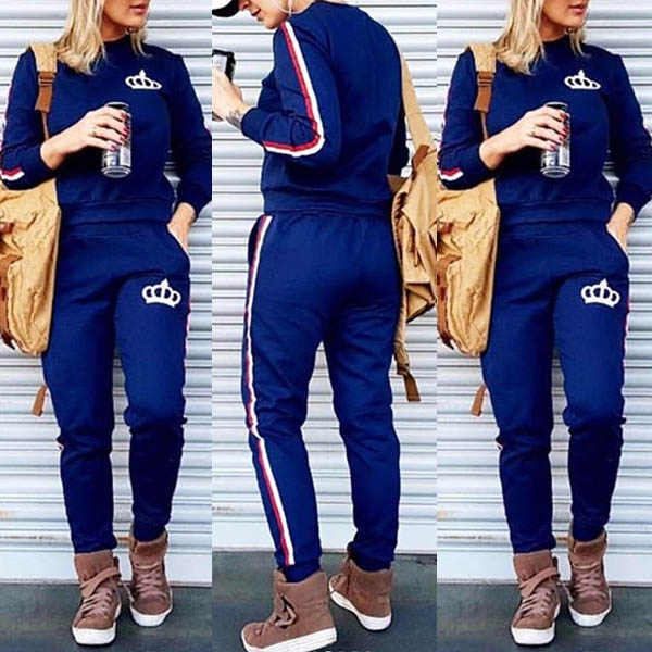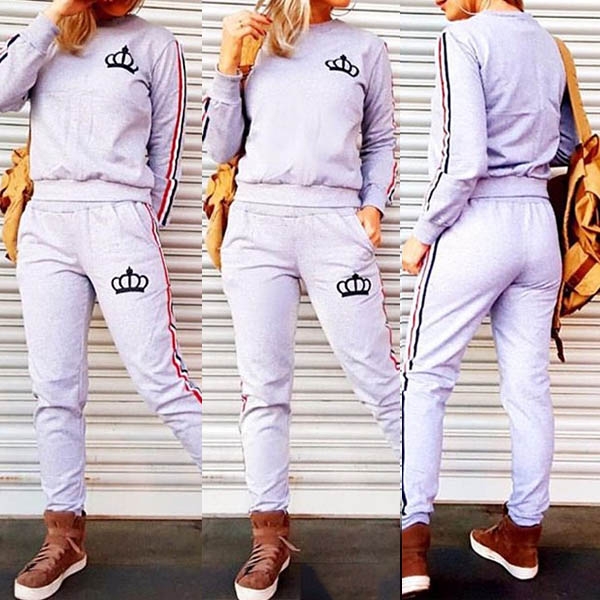 a long sleeve round neck sweatshirt and a pants,the crown printed pattern and striped spliced design