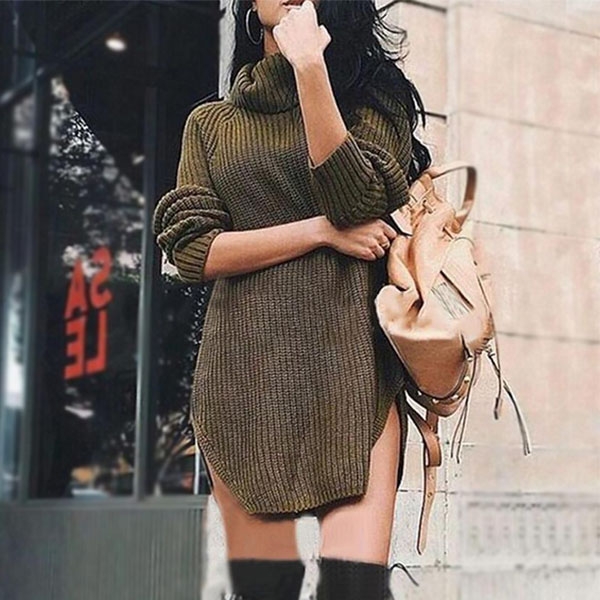 This knit dress features a solid color,finished with long sleeve,turtleneck and a slit hem,simple,