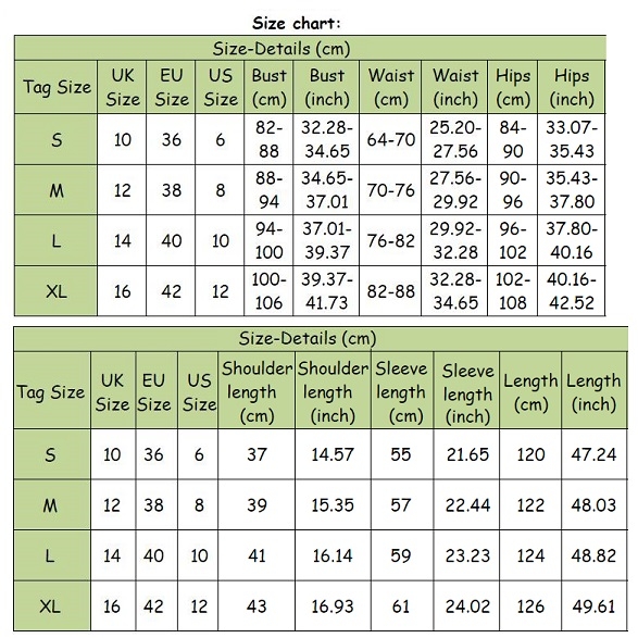 XL : Bust : 100cm - 106cm(39.37" - 41.73"); Waist : 82cm - 88cm(32.28" - 34.65"); Hips : 102cm - 108cm(40.16" - 42.52"); Shoulder : 43cm(16.93"); Sleeve : 61cm(24.02"); Length : 126cm(49.61");