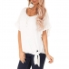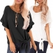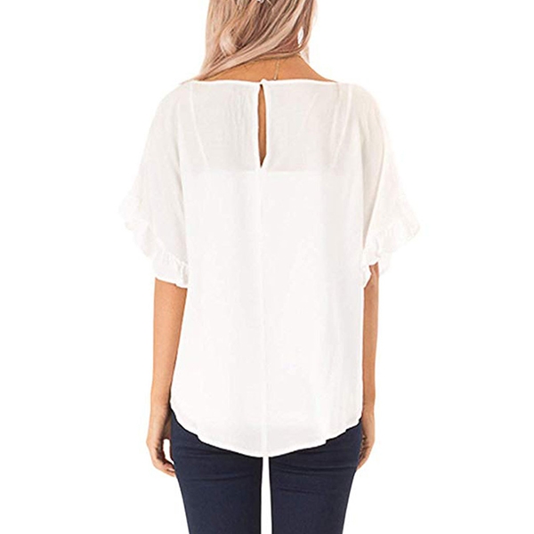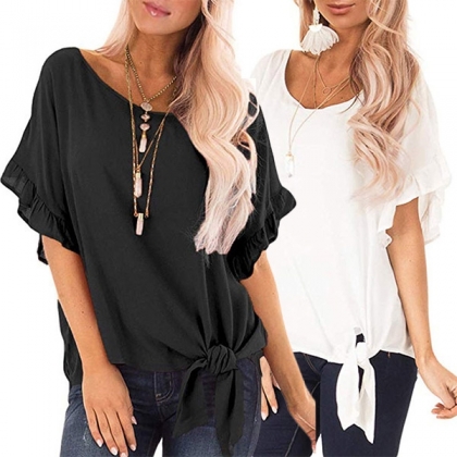 This t-shirt boasts a solid color,finished with lotus sleeve and round neck design,which is sure to