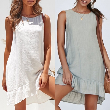 Fashion Solid Color Round-neck Sleeveless Lotus Spliced Slim Fit Dress