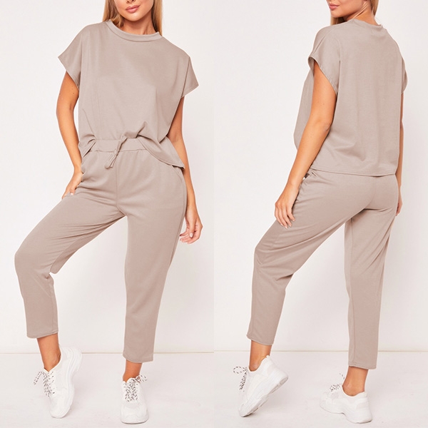 including a short sleeve round neck top and a pants,crafted from soft and breathable fabric,this two-piece
