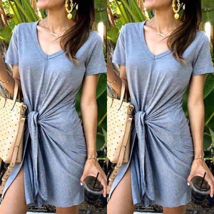 Fashion Solid Color Short Sleeve V-neck Knotted Dress