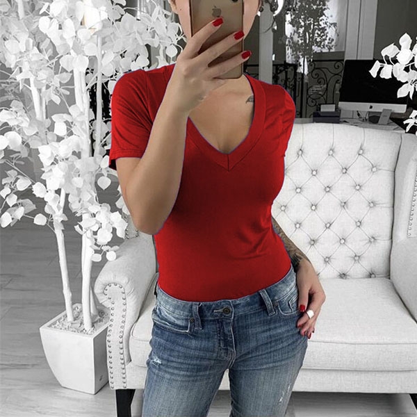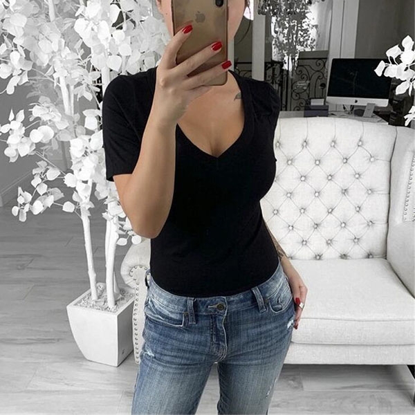 This t-shirt features a solid color,simple yet stylish. Finished with short sleeve,v-neck and a fit silhouette,