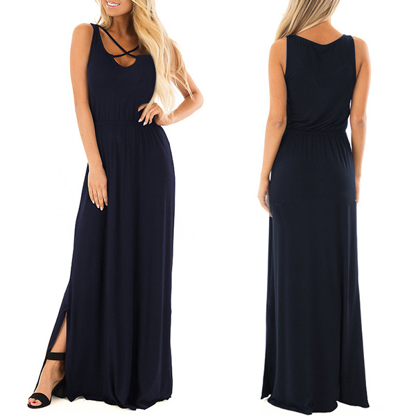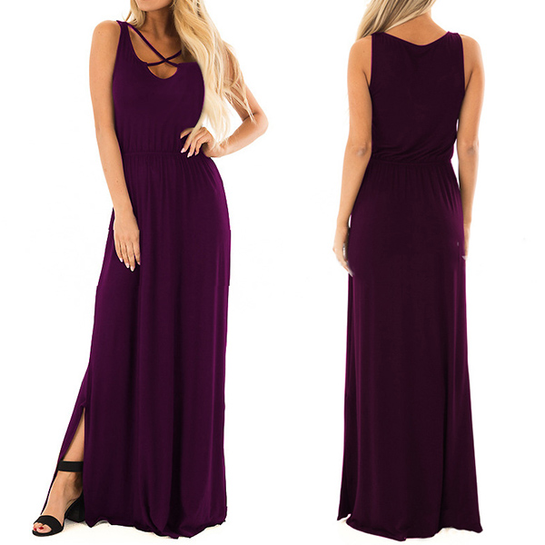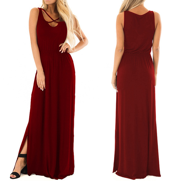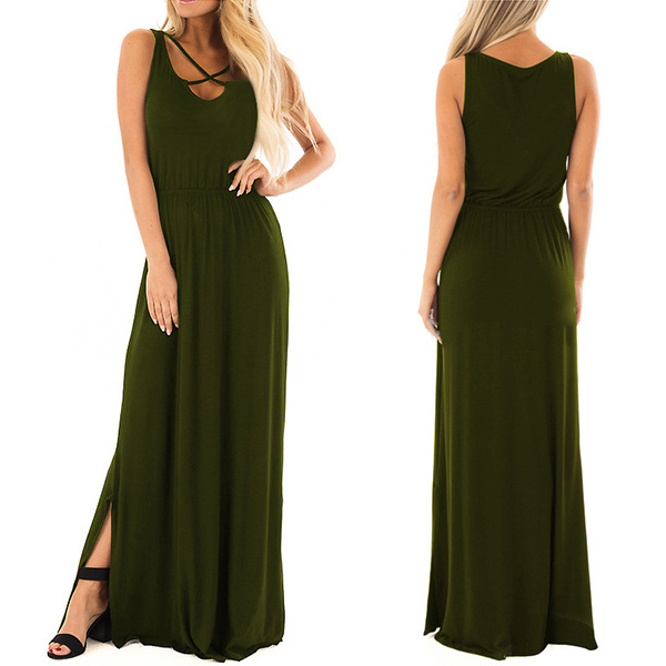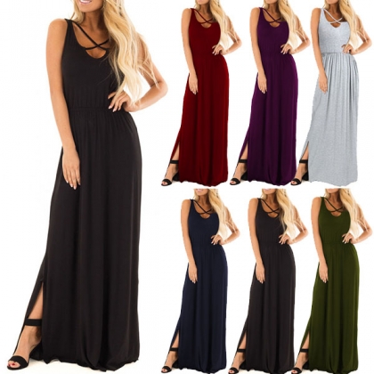 Fashion Solid Color Sleeveless Crossover V-Neck Slit Hem Dress
