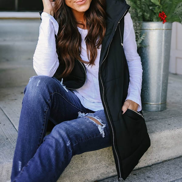 with sleeveless and hooded silhouette design,simple,cozy yet generous. And the zipper pockets design