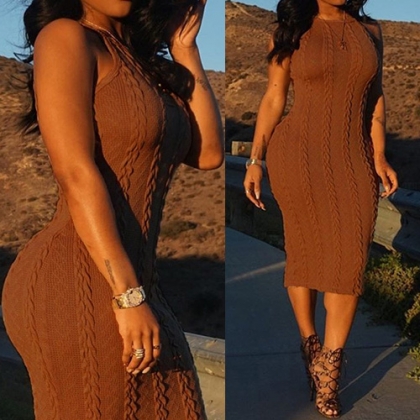 This sweater dress features solid color style,with sleeveless,round neckline,a mid length and