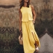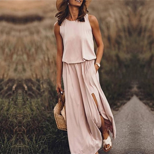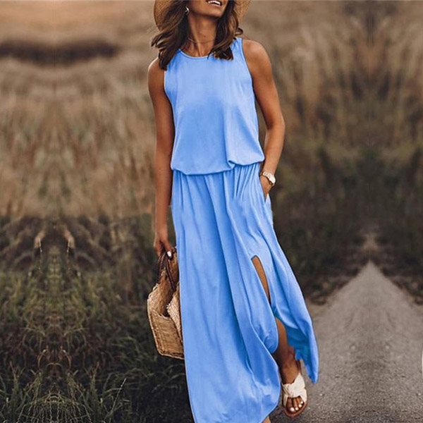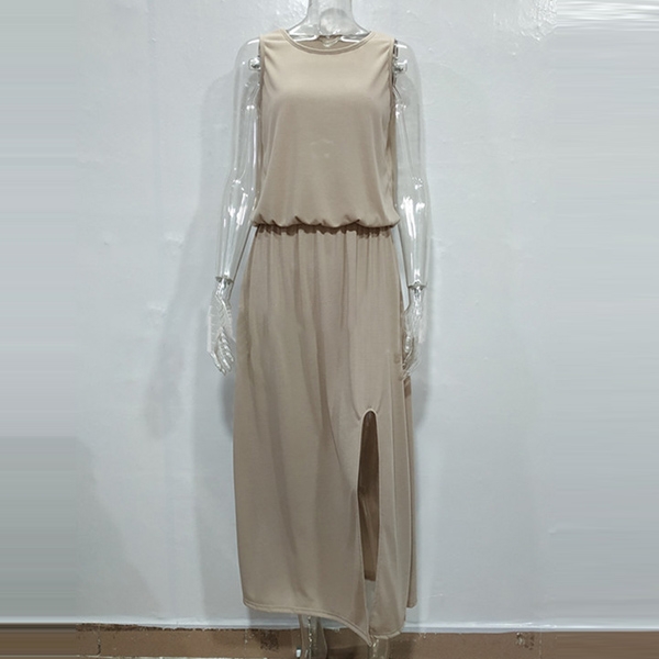 Comes with a solid color,with sleeveless,round neck,slit hem and a maxi length,