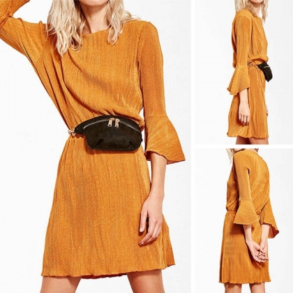 Solid color style,finished with trumpet sleeve and round neck design,this piece can give you a cozy