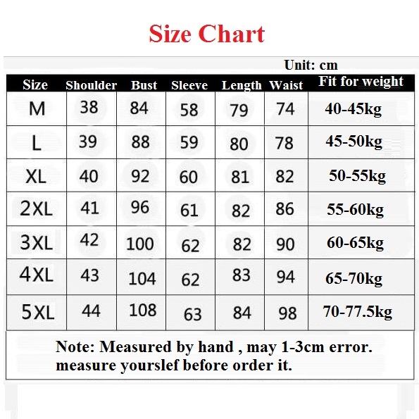 5XL: Bust:108cm(42.52"); Waist:98cm(38.58"); Shoulder:44cm(17.32"); Sleeve:63cm(24.8"); Length:84cm(33.07");