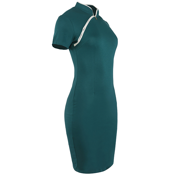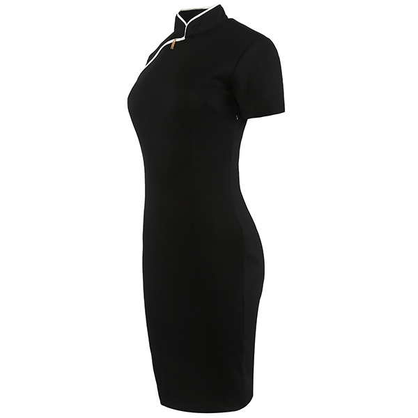 Kontrasfärgad stil, med stativkrage och kort ärm, enkel men moderiktig. Sned dragkedja vid
