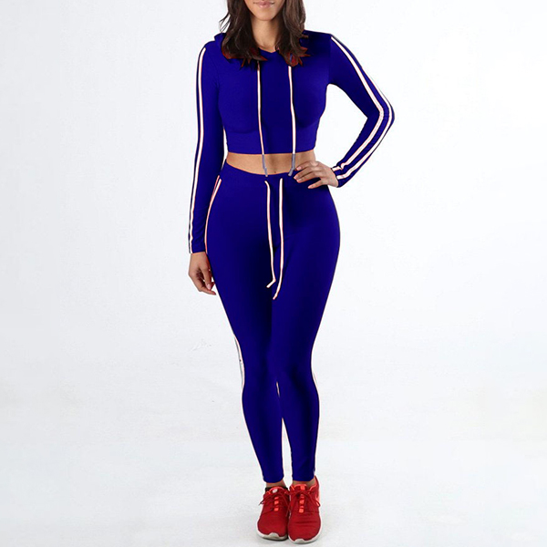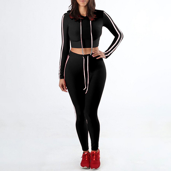 Även under din sporttid kan du visa upp din perfekta figur om du väljer detta tvådelade set som din partner.Randig skarvad design berikar designstilen.Inklusive en långärmad croptop med huva och en byxa, dess mjuka och andningsbara tyg Kan lova dig en bekväm dag. Njut av din sporttid i detta tvådelade set!