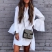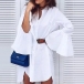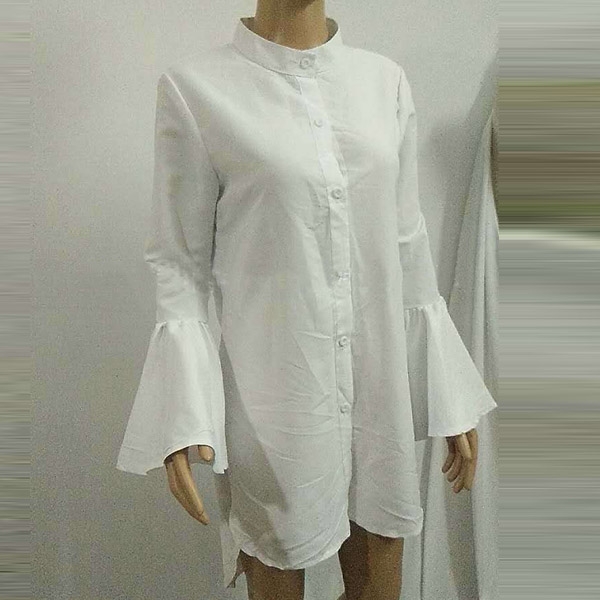 chic and stylish taste. Solid color style,finished with trumpet sleeve,stand collar and a high-low hem