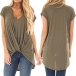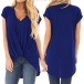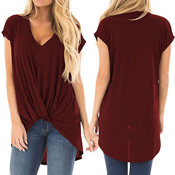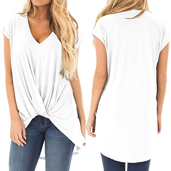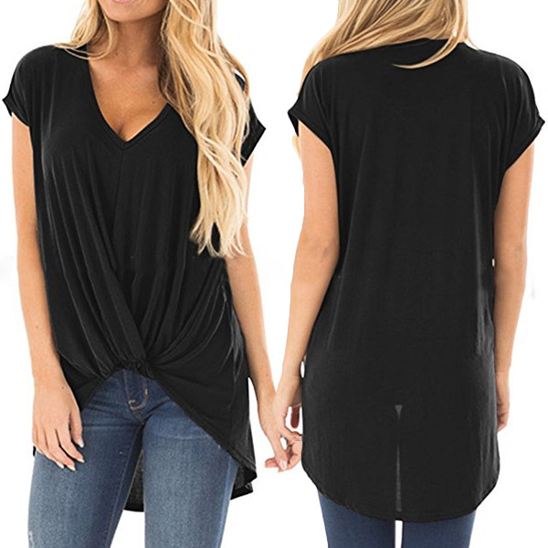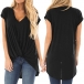 This short sleeve top feature a long-line silhouette with twist-front design, a V-neckline,