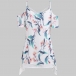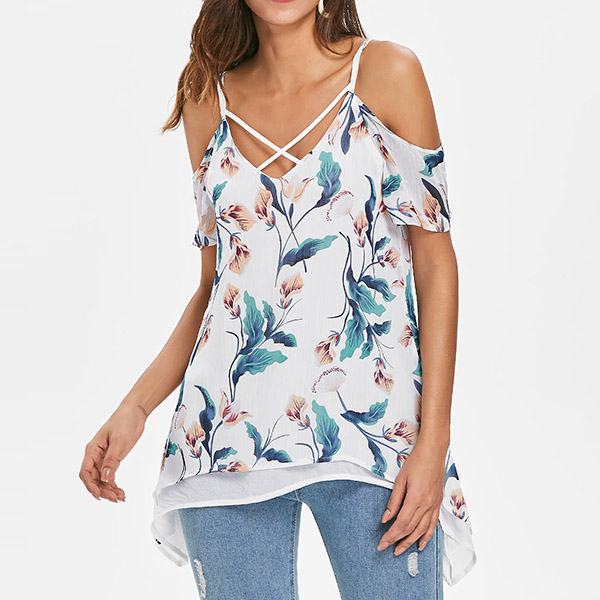 shoulder strap, irregular hem, open shoulder, short sleeve. Slip into fashionable jeans and strappy