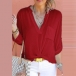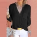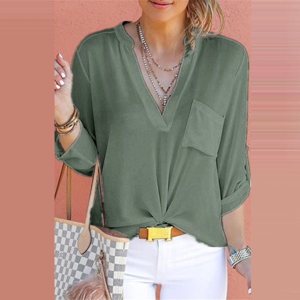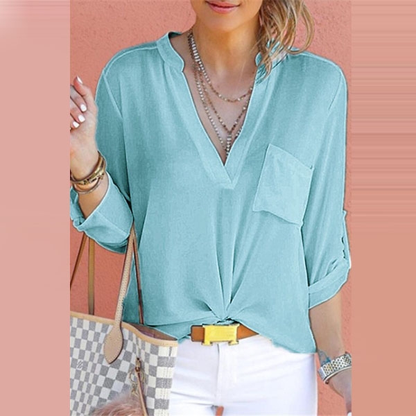 feature a split V-neckline, front chest patch pocket, roll-tab sleeves, come with solid color design style, tuck it into