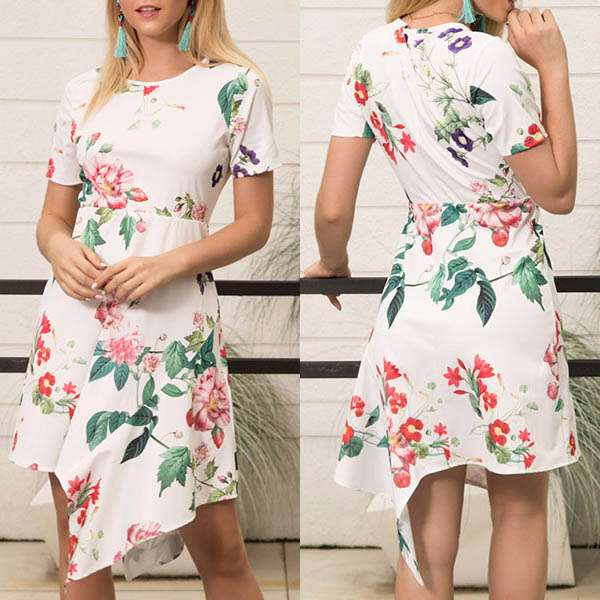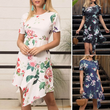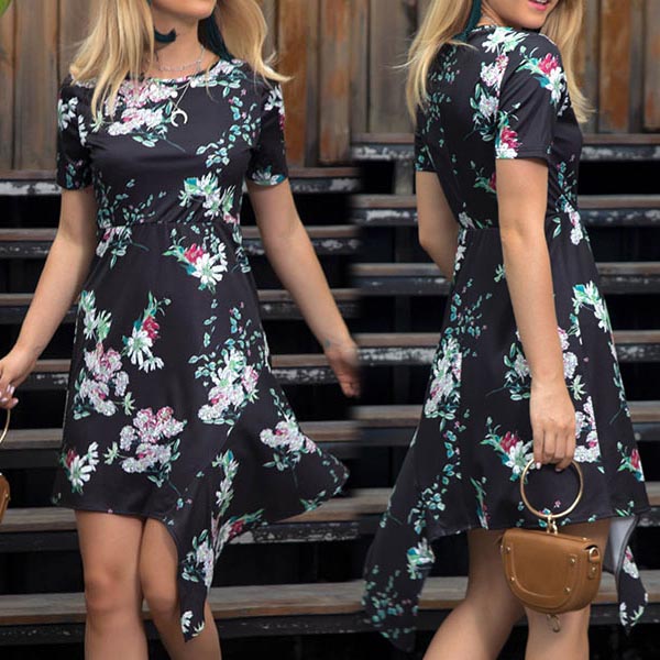Boasts vibrant and eye-catching floral print,finished with short sleeve,round neck and an irregular hem,