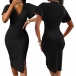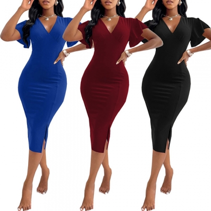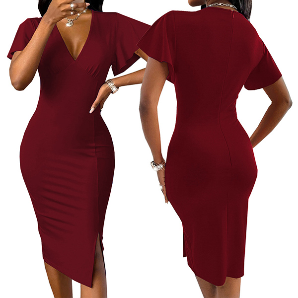 OL Style Short Sleeve V-neck Solid Color Slim Fit Pencil Dress