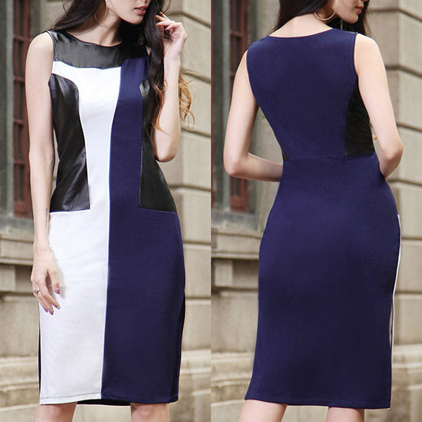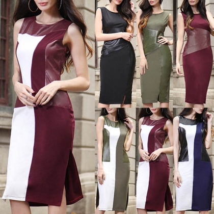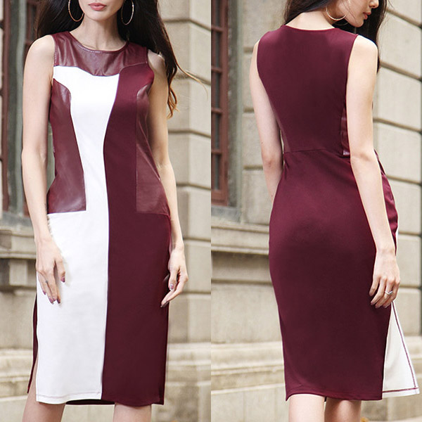 occasions. This dress is a good example. The PU leather spliced and contrast color design enrich the