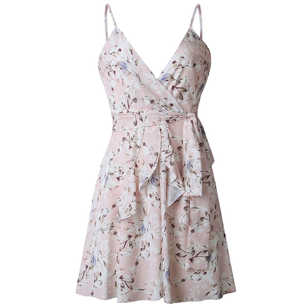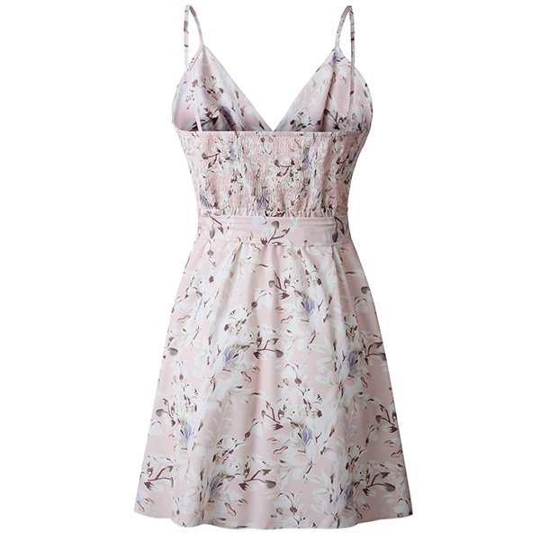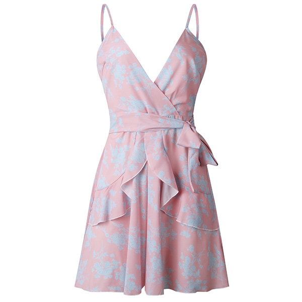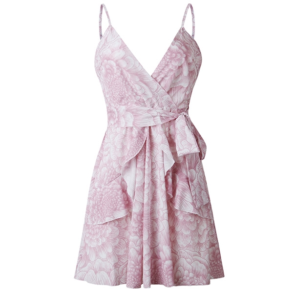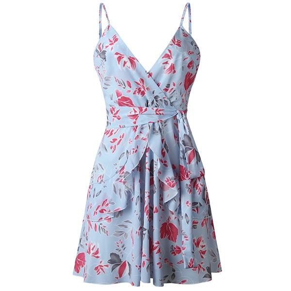Sexy Backless Deep V-neck Ruffle Hem Printed Sling Dress