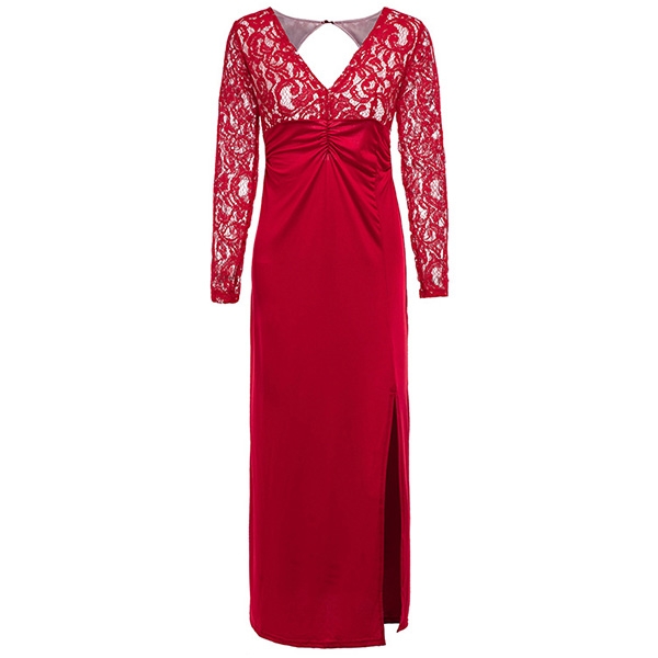 like backless,deep v-neck,slit hem and lace spliced design make this piece look so sexy and charming.