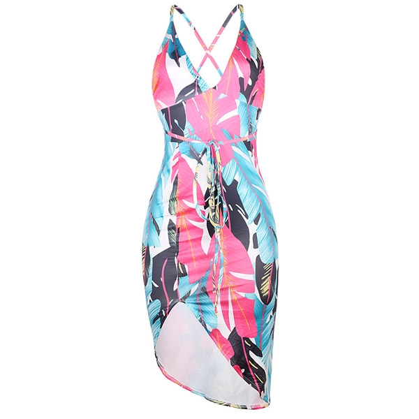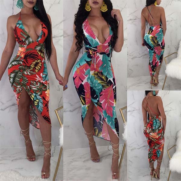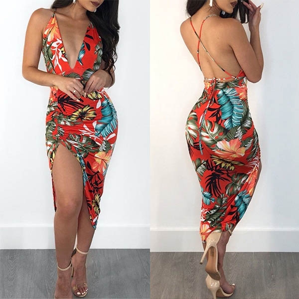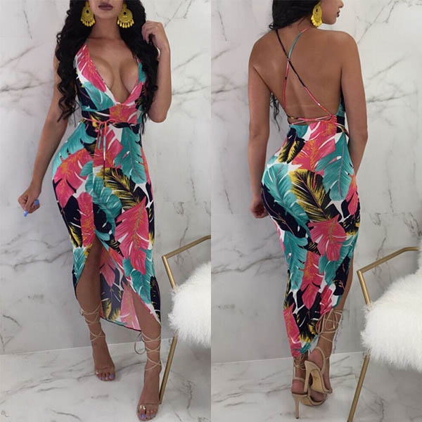 Sexy Backless Deep V-neck Slit Hem Slim Fit Printed Dress