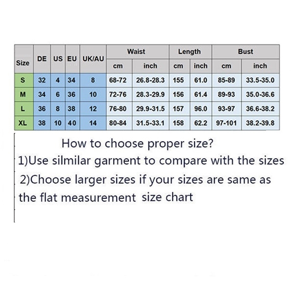 XL : Bust : 97cm - 101cm(38.19" - 39.76"); Waist : 80cm - 84cm(31.5" - 33.07"); Length : 158cm(62.2");