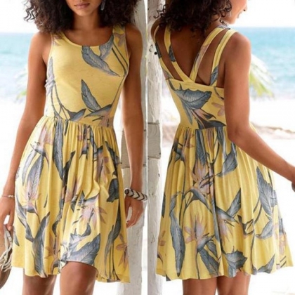 with chic printed details,with sleeveless,round neck and backless design,this beautiful dress can